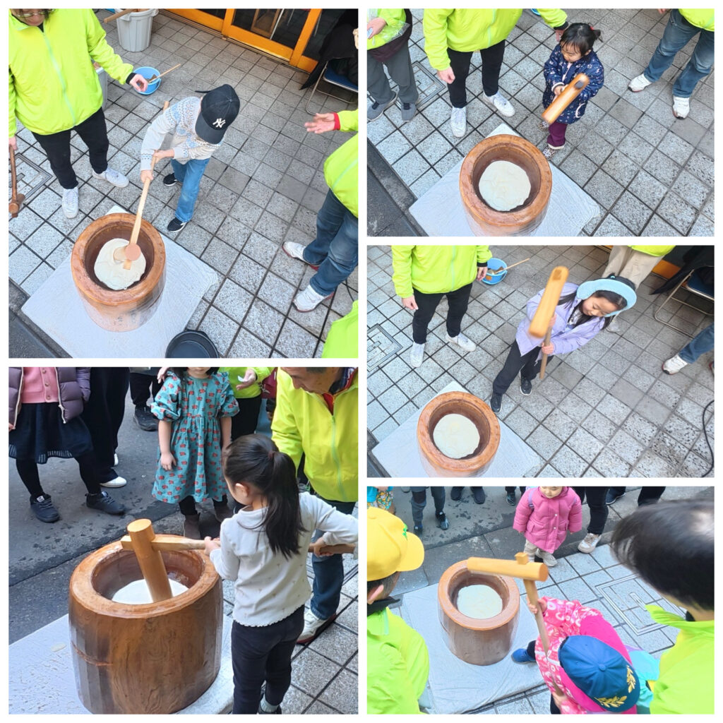 来場者もお子さんが多数来場され、町会役員の「ヨイショ」の掛け声の下、小さなお子さんが一生懸命杵つきをされる姿が微笑ましく、杵つきの後は澄み切った寒空の空の下、炊き立ての柔らかいお餅を食べて楽しいひとときを過ごしました。