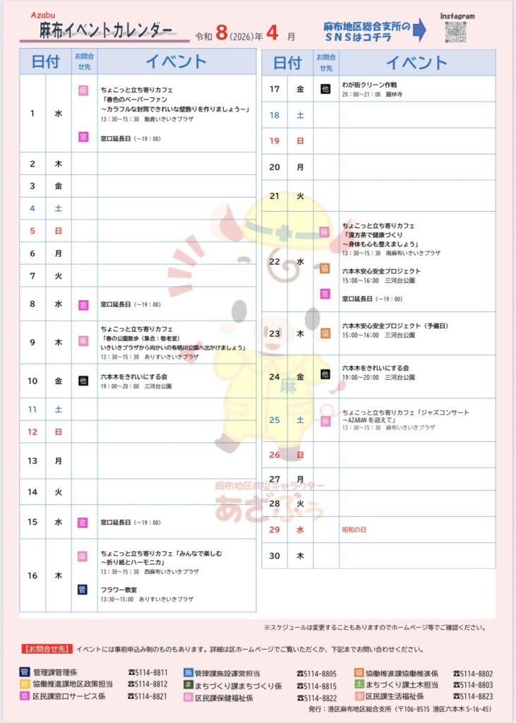 <港区からのお知らせ>4月の麻布イベントカレンダーです